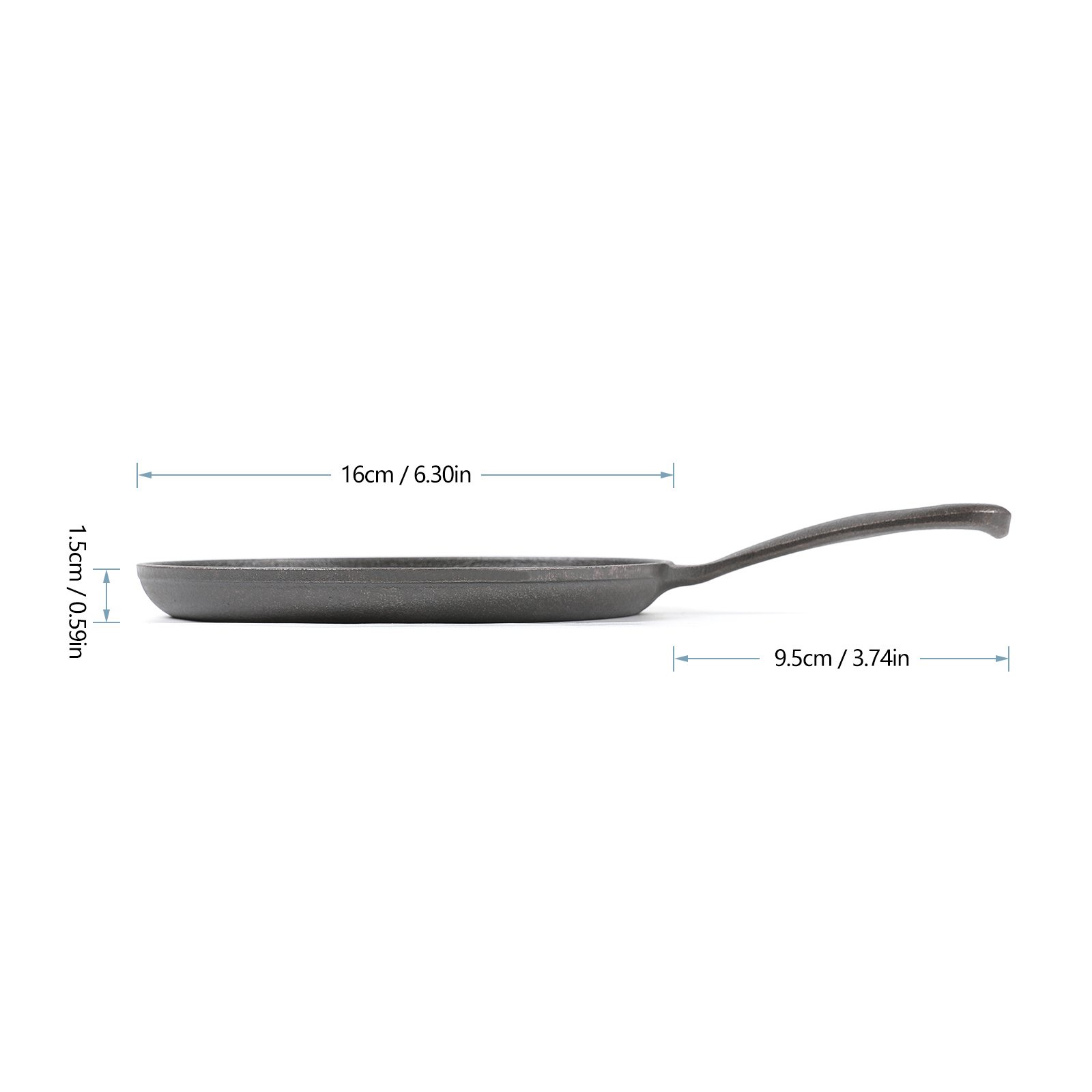 1.Size: 10''L(with the handle)x 6.3''D x 0.59''H. Multiple Uses: Use to sear, sauté, bake, fry, broil, or grill. Pre-seasoned: Pre-seasoned and ready to use Just wash and start cooking-no seasoning required.