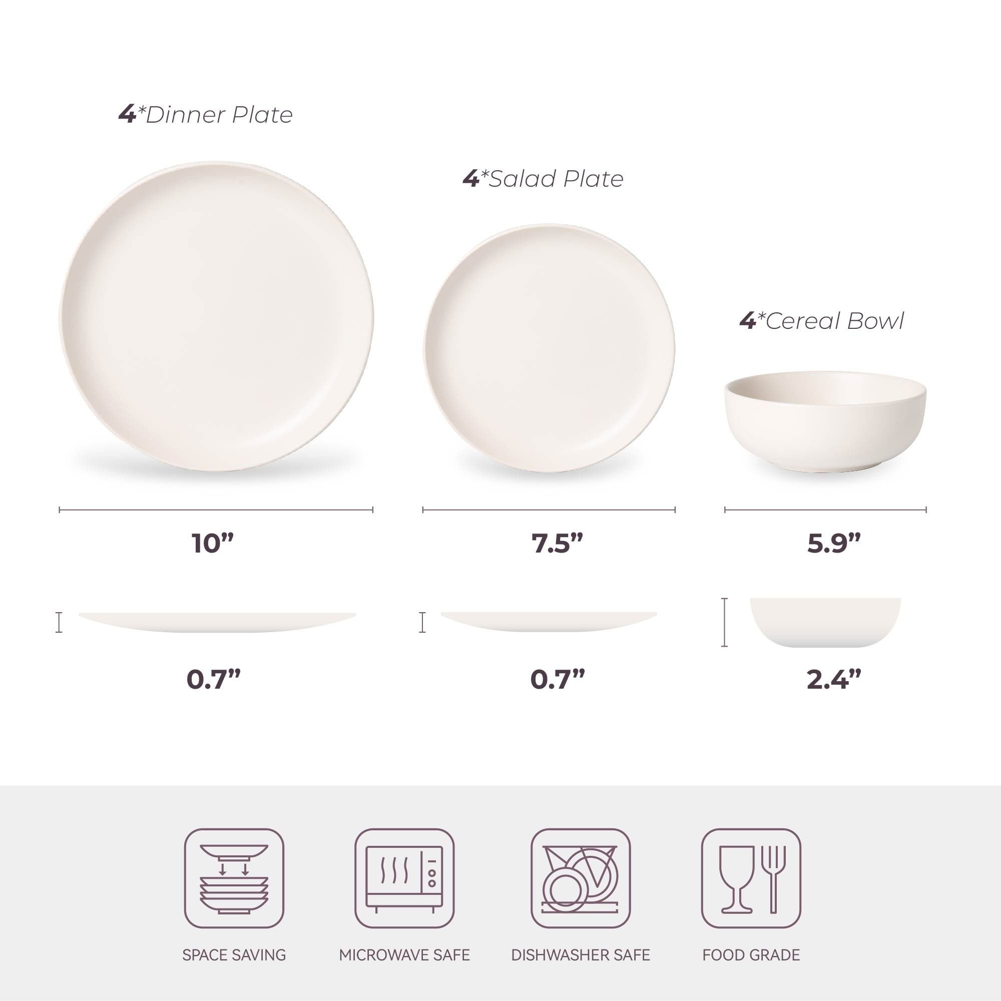 2. "[Complete 12pc Service for 4]": "Includes 4 dinner plates (10\"), 4 salad plates (7.5\"), and 4 deep cereal bowls (5.9\") - perfect for family meals or entertaining guests."